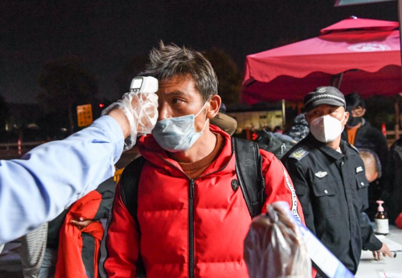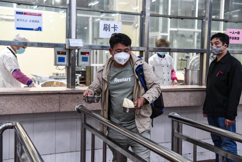 員工們下車集結(jié)之后,防疫工作人員依次為他們測量體溫并進(jìn)行消毒防護(hù)處理,指引員工們有序進(jìn)食堂就餐,然后回宿舍休息,為第二天安全復(fù)工做好準(zhǔn)備。